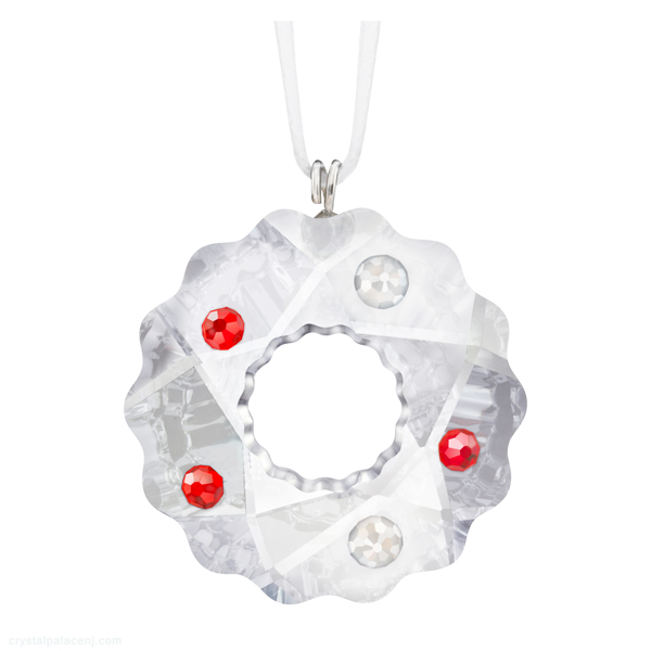 SwarovskiChristmas Wreath This delicious Crystal Moonlight design is decorated with Light Siam Satin and Platinum White crystal sugar beads. Dangling from a white satin ribbon, it hangs elegantly on your tree or makes an eye-catching and original table, napkin, or window decoration. Place a selection of mini ornaments together for a wonderfully festive effect.
