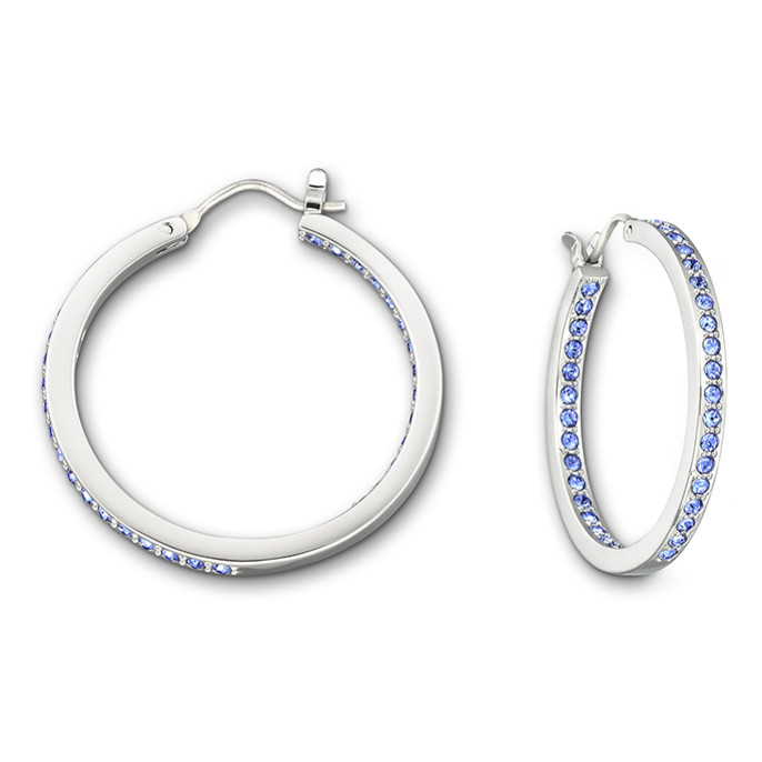 This pair of pierced earrings lends a bright, refreshing note to any outfit. The stainless steel hoops are embellished in Sapphire crystal pavé, bringing an intense splash of color to this pure design. Combine the earrings with the Rainbow necklace for a colorful summer look.