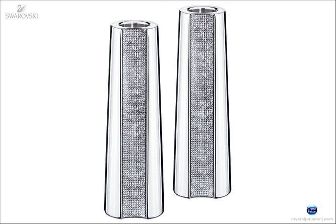Prepare the perfect romantic dinner with this set of two candleholders. Each one is embellished with delicate clear crystal chatons which capture and reflect the light beautifully. With pure shapes and clean lines, they shine in high polished stainless steel.