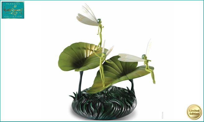 In creating the "Nutcracker Suite" sequence for Fantasia, Walt Disney told his filmmakers, "It should be something beautiful and something fantastic," adding that he wanted a "will-o'-the-wisp" feeling. In response, the Disney artists created exceptionally elaborate animation cels to attain the fanciful feeling the master storyteller sought, and this new sculpture perfectly captures that ethereal spirit. Portraying the garden-fresh Summer Fairies, who charmingly awaken to celebrate the full flowering of Summer, this exquisitely sculpted piece conveys all the loveliness of nature and the magic of these sweet sprites. Plussed with three bronze fairies, this enchanting sculpture reflects the delicate artistry of Walt Disney's animated masterpiece. This latest Fantasia sculpture is indeed something beautiful, something fantastic, and perfectly complements the Walt Disney Classics Collection's other entrancing Fantasia Fairy sculptures.